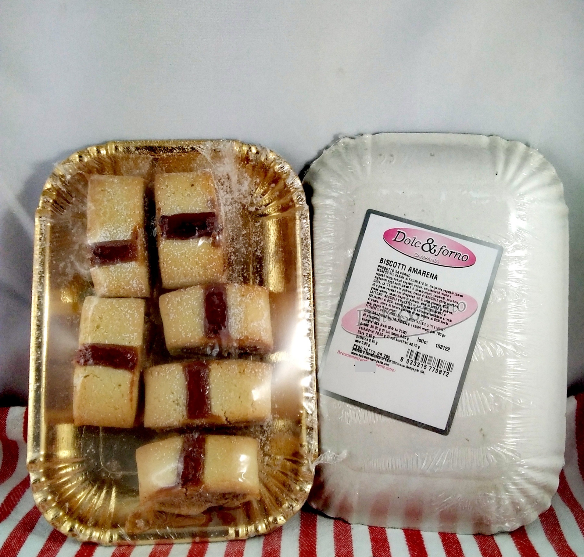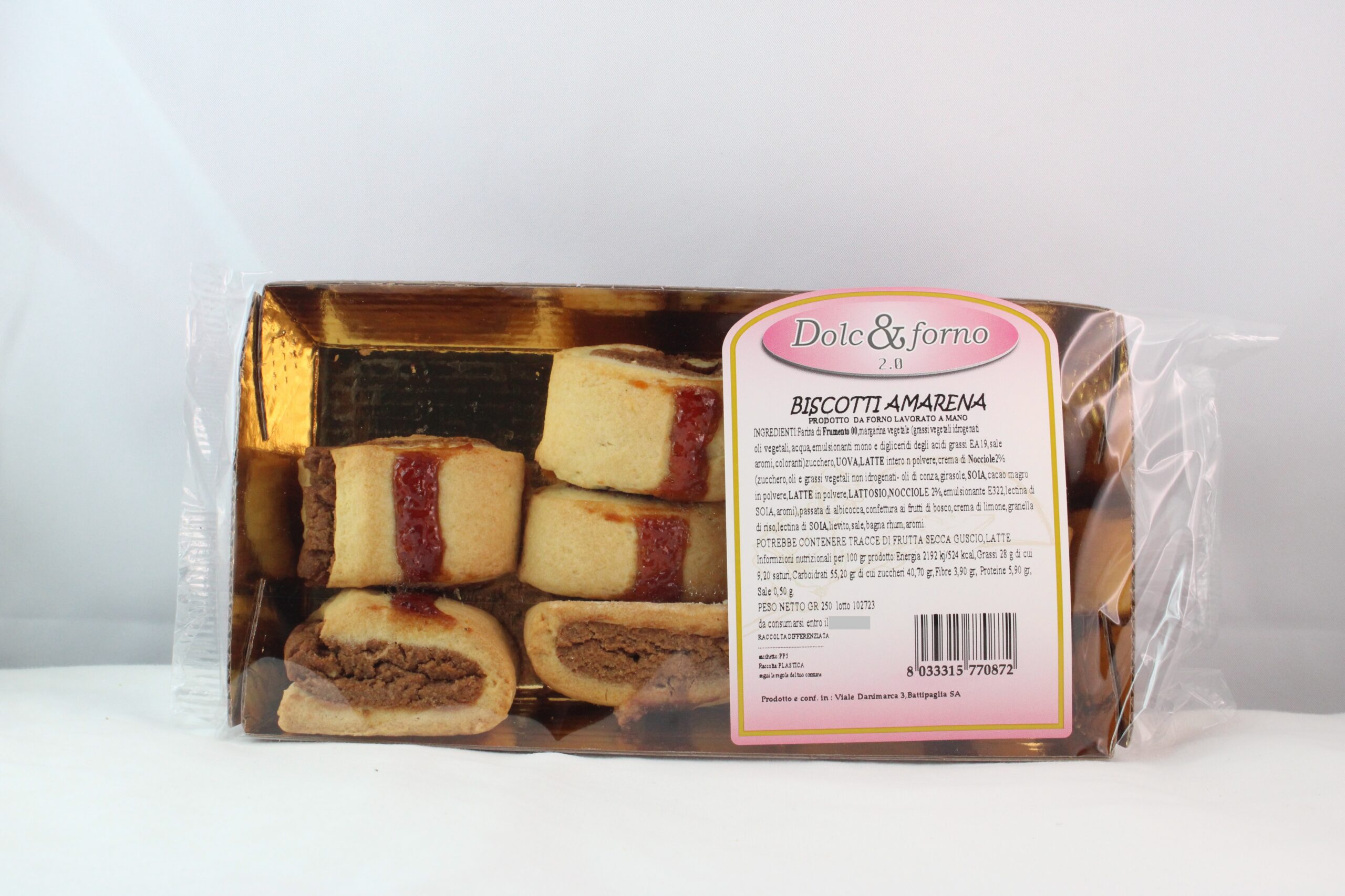 Ingredienti: Farina di grano tenero 00 ; Margarina vegetale; Zucchero; Uova; Latte intero in polvere; Crema di Nocciole 2%; Passata di ciliegia (sciroppo di glucosio; Fruttosio; Purea di ciliegia; Zucchero; Gelificanti; Pectina; Correttore di acidità; Acido citrico; Conservanti: sorbato di potassio e anidrite fosforosa e aromi); Sciroppo di amarena 5%; Crema di cioccolato; Uova pastorizzate; Destrosio; Lievito in polvere; Bicarbonato; Sale; Aroma vanillina.