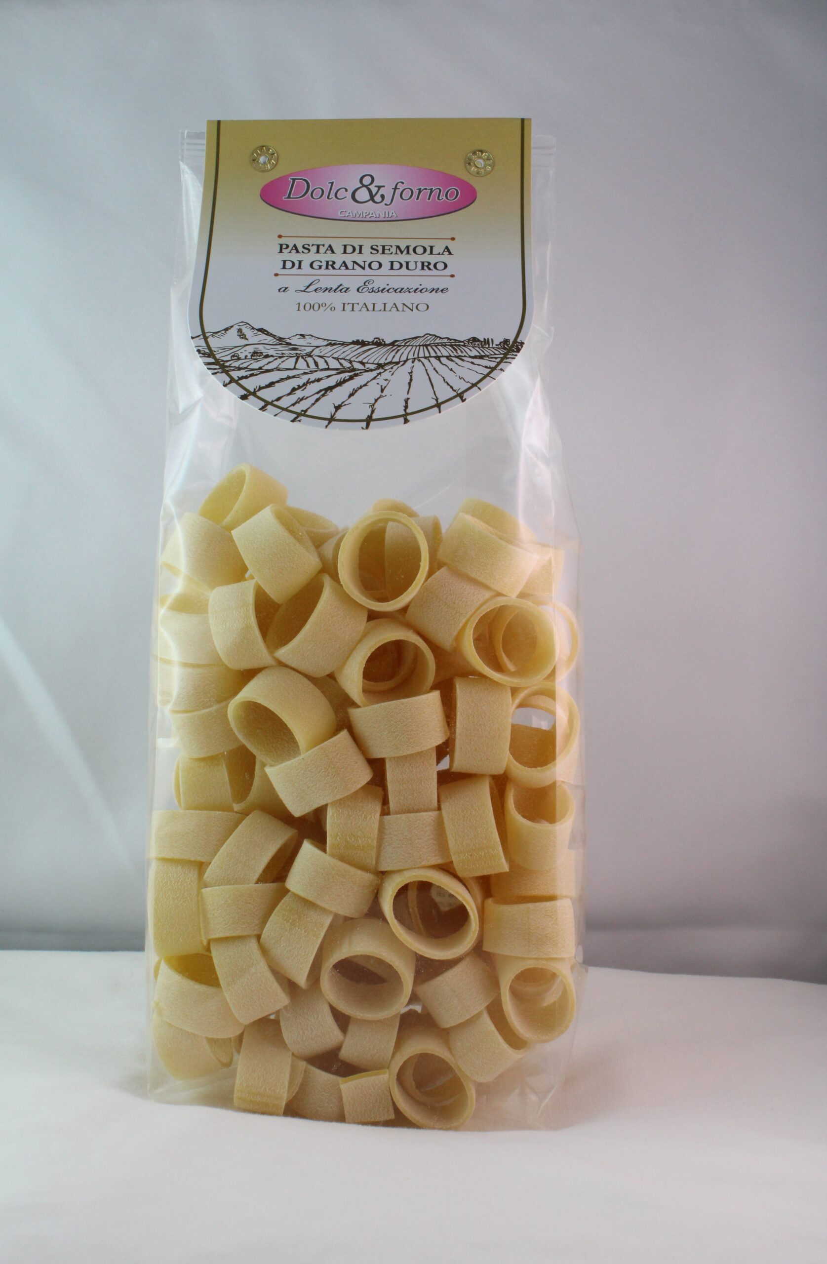 INGREDIENTI: Semola di GRANO duro ,100% ITALIANA La pasta alimentare è denominata “ Pasta di semola di grano duro” se ottenuta dalla trafilazione , laminazione e conseguente essiccamento lento senza aggiunta di aria calda (processo che varia da 30 h fino a 46 h) di impasti preparati con semola di grano duro e acqua. Nella formazione dell’impasto vengono impiegate esclusivamente semole di grano duro e non vengono aggiunte sostanze coloranti né conservanti.