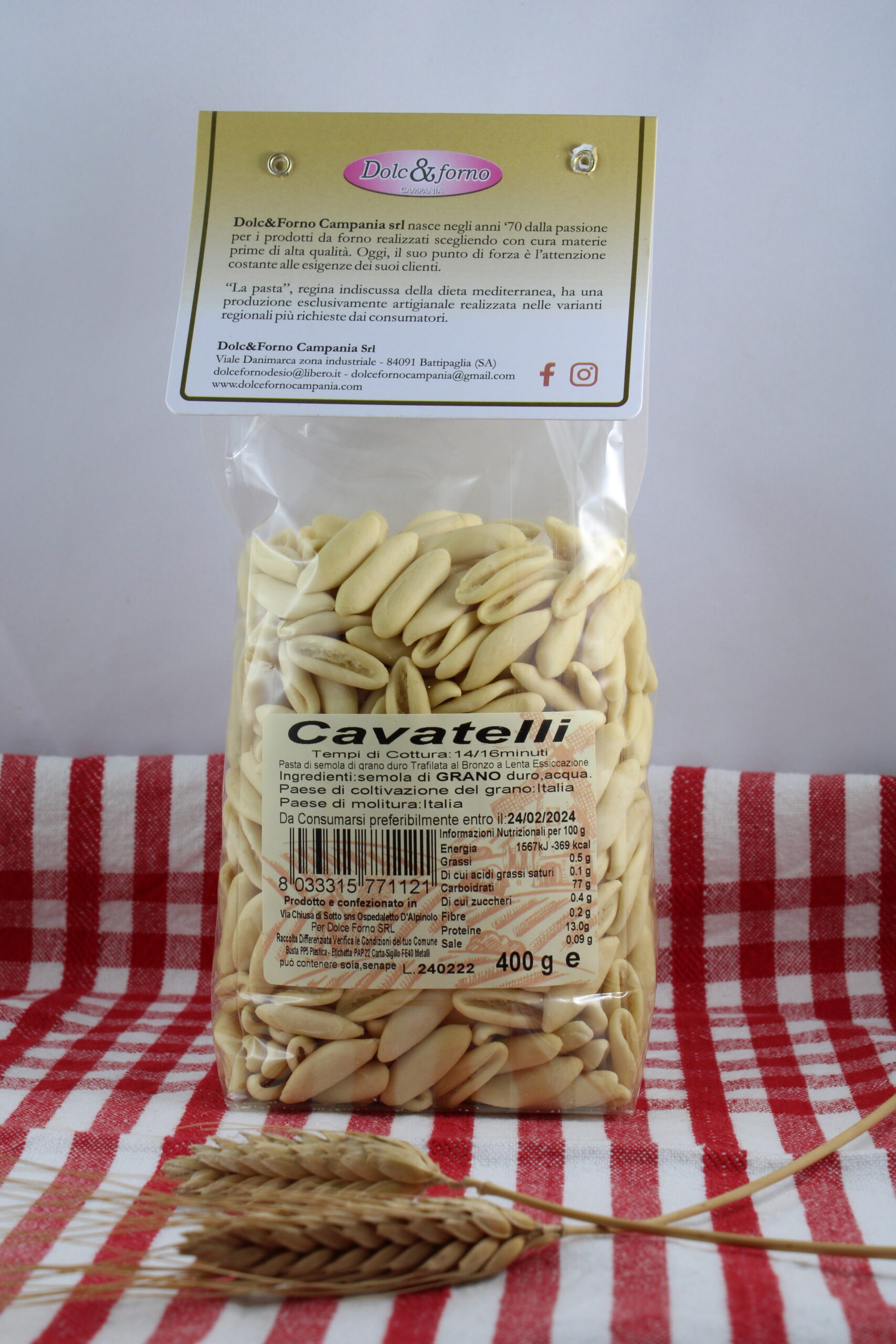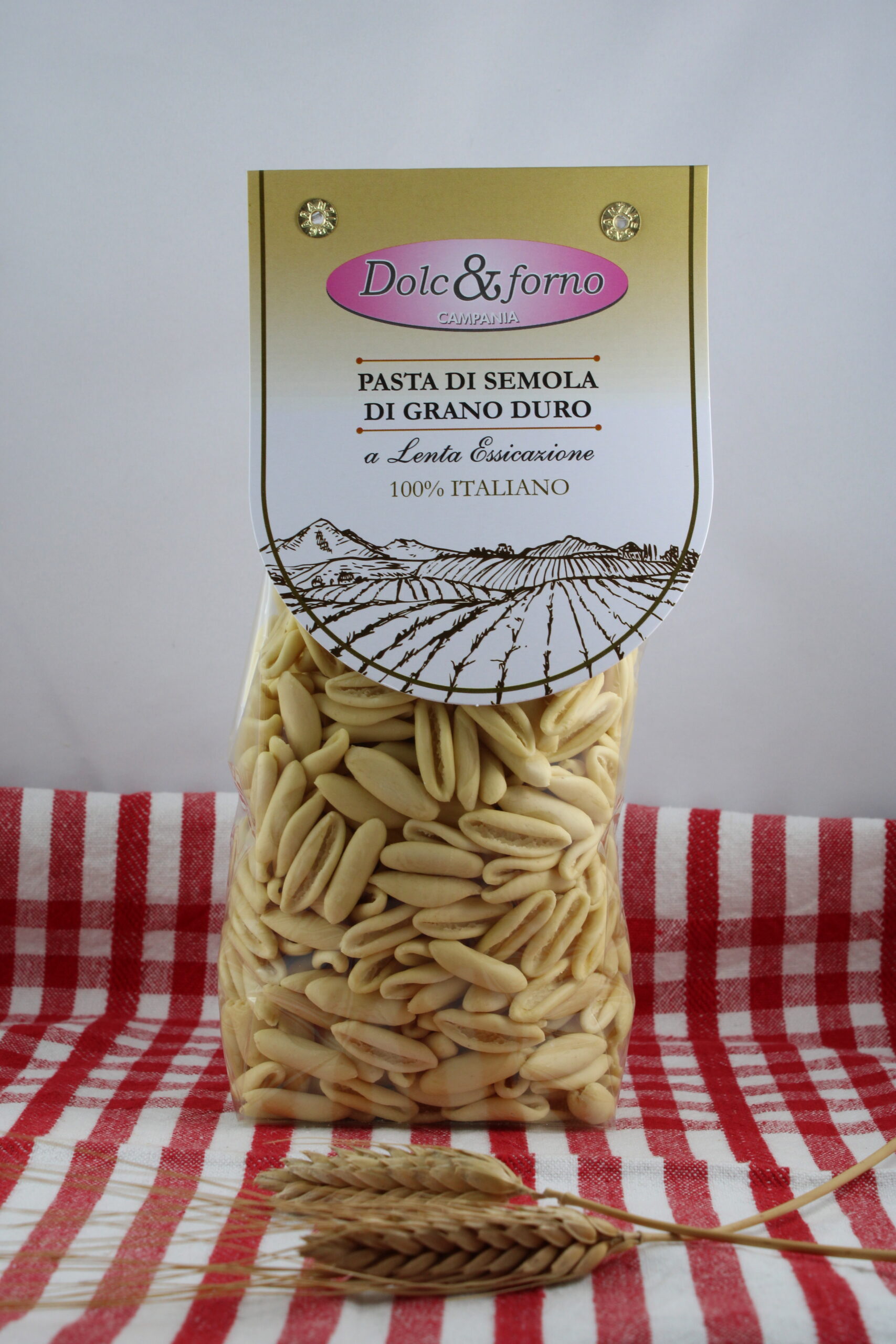 INGREDIENTI: Semola di GRANO duro ,100% ITALIANA La pasta alimentare è denominata “ Pasta di semola di grano duro” se ottenuta dalla trafilazione , laminazione e conseguente essiccamento lento senza aggiunta di aria calda (processo che varia da 30 h fino a 46 h) di impasti preparati con semola di grano duro e acqua. Nella formazione dell’impasto vengono impiegate esclusivamente semole di grano duro e non vengono aggiunte sostanze coloranti né conservanti.