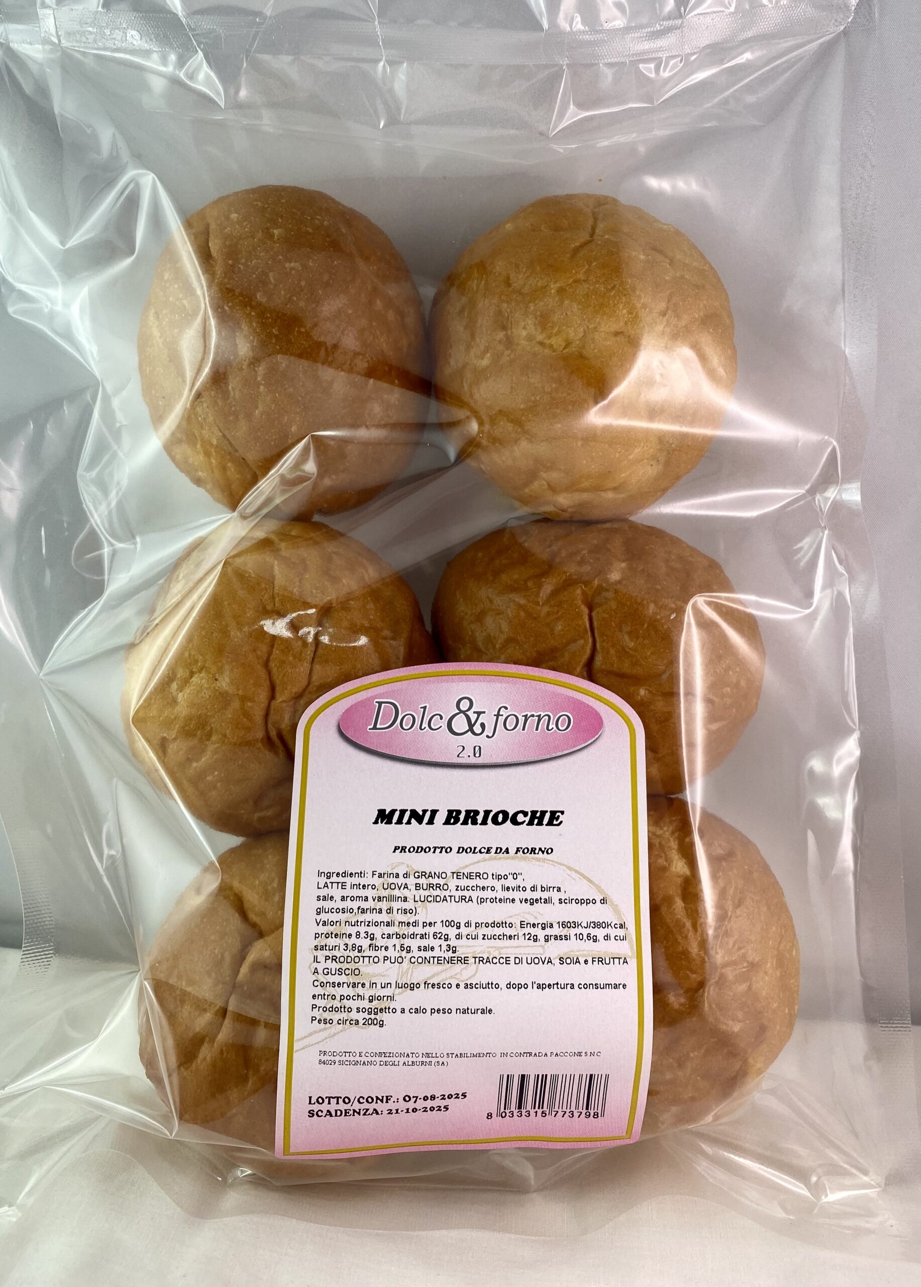 Ingredienti: Farina di grano tenero tipo “0”, latte intero, uova, burro, zucchero, lievito di birra, sale, aroma vanillina. Lucidatura (proteine vegetali, sciroppo di glucosio, farina di riso).