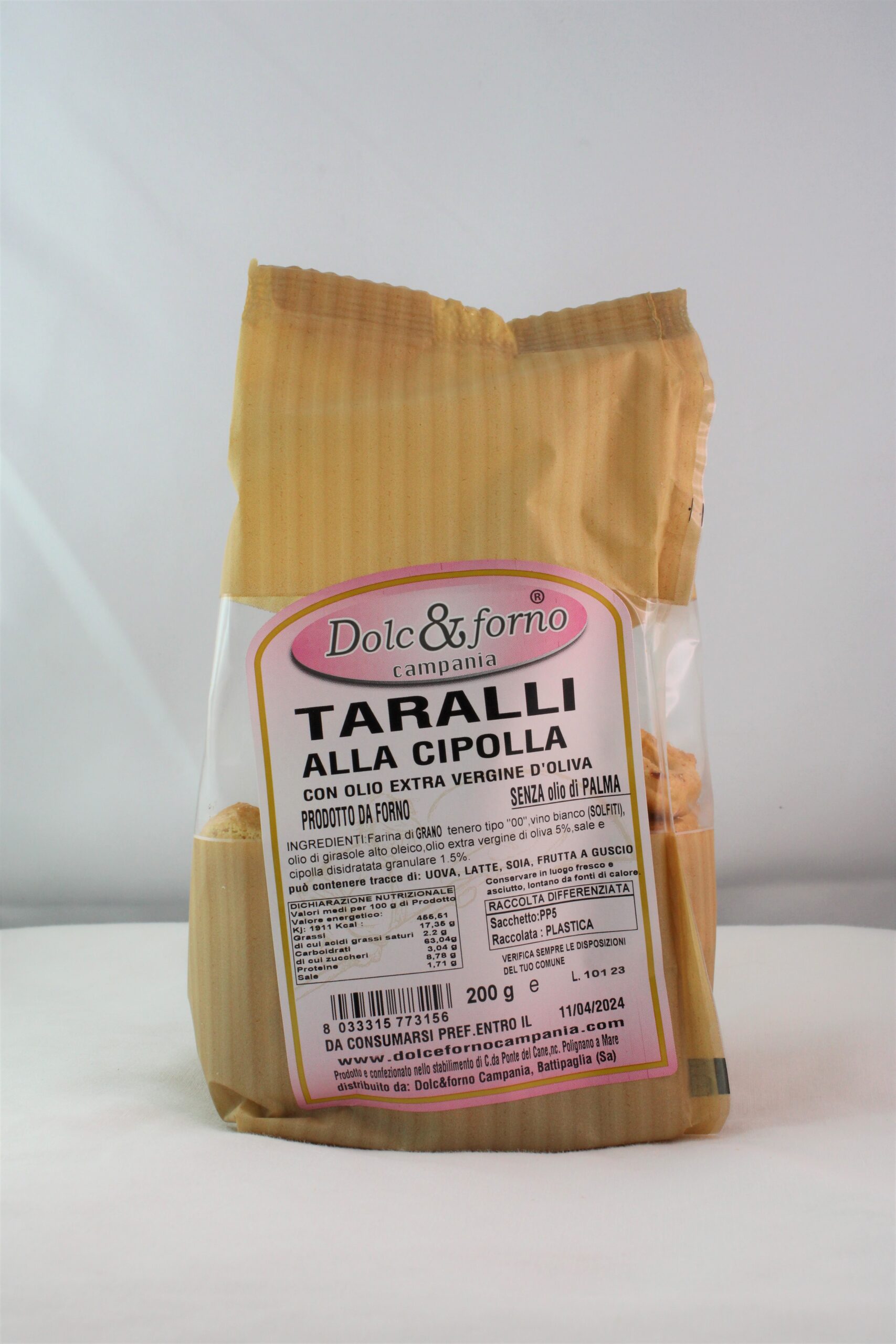 Ingredienti: Farina di GRANO tenero tipo “00”, vino bianco (contiene solfiti), olio di girasole alto oleico, olio extra vergine di oliva 5%, sale, cipolla disidratata granulare 1,5 %.