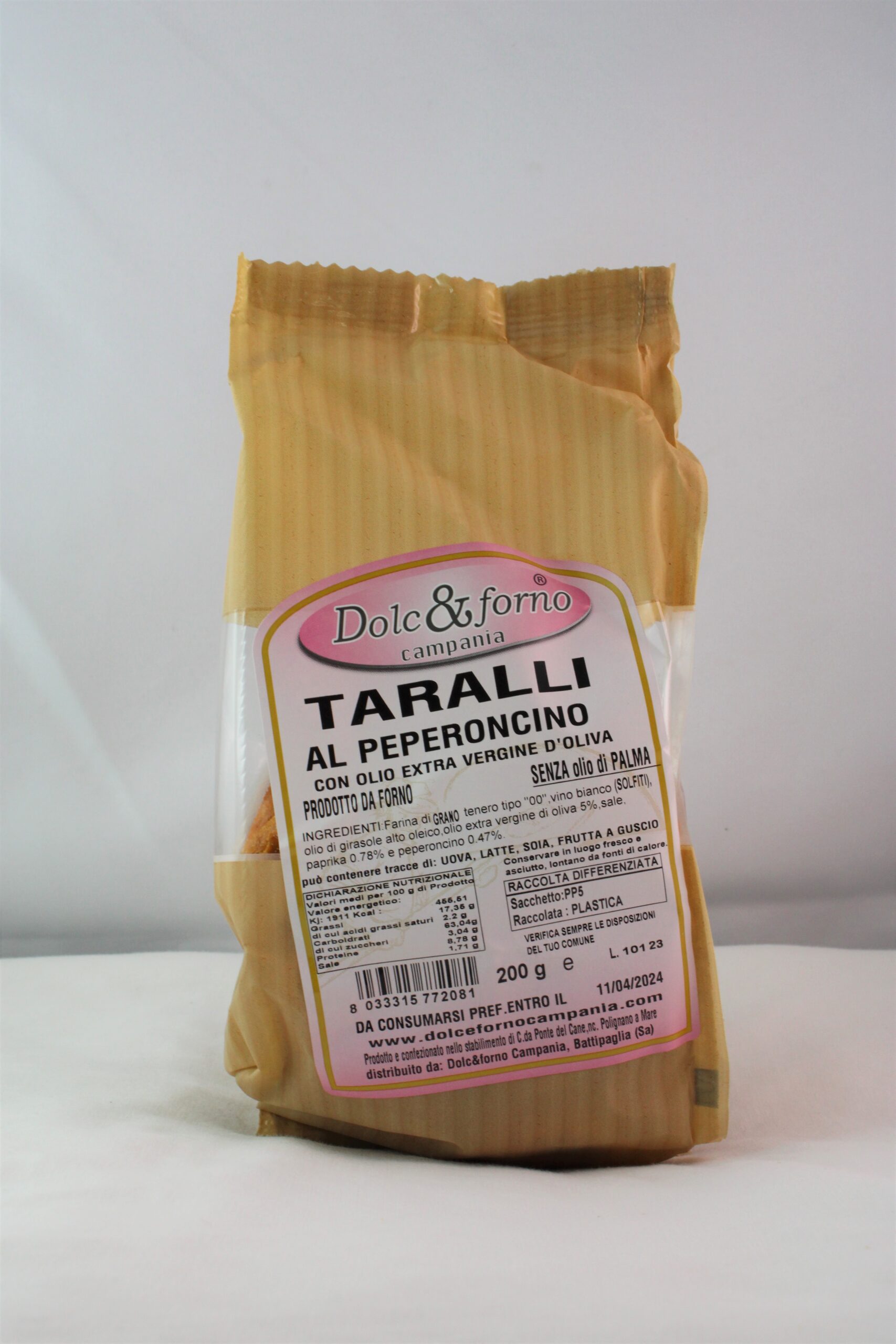 Ingredienti: Farina di GRANO tenero tipo “0”, olio di girasole alto oleico, olio extra vergine d’oliva, vino bianco, peperoncino disidratato 1%, sale. Può contenere tracce di SESAMO.