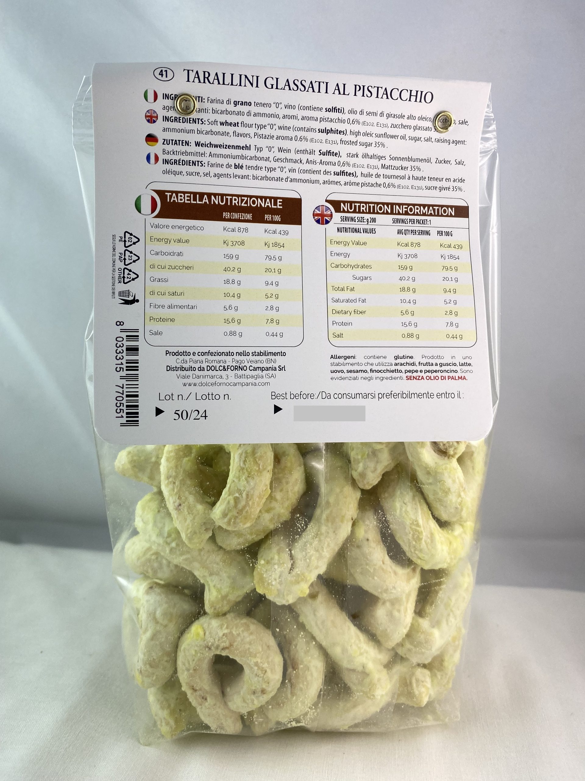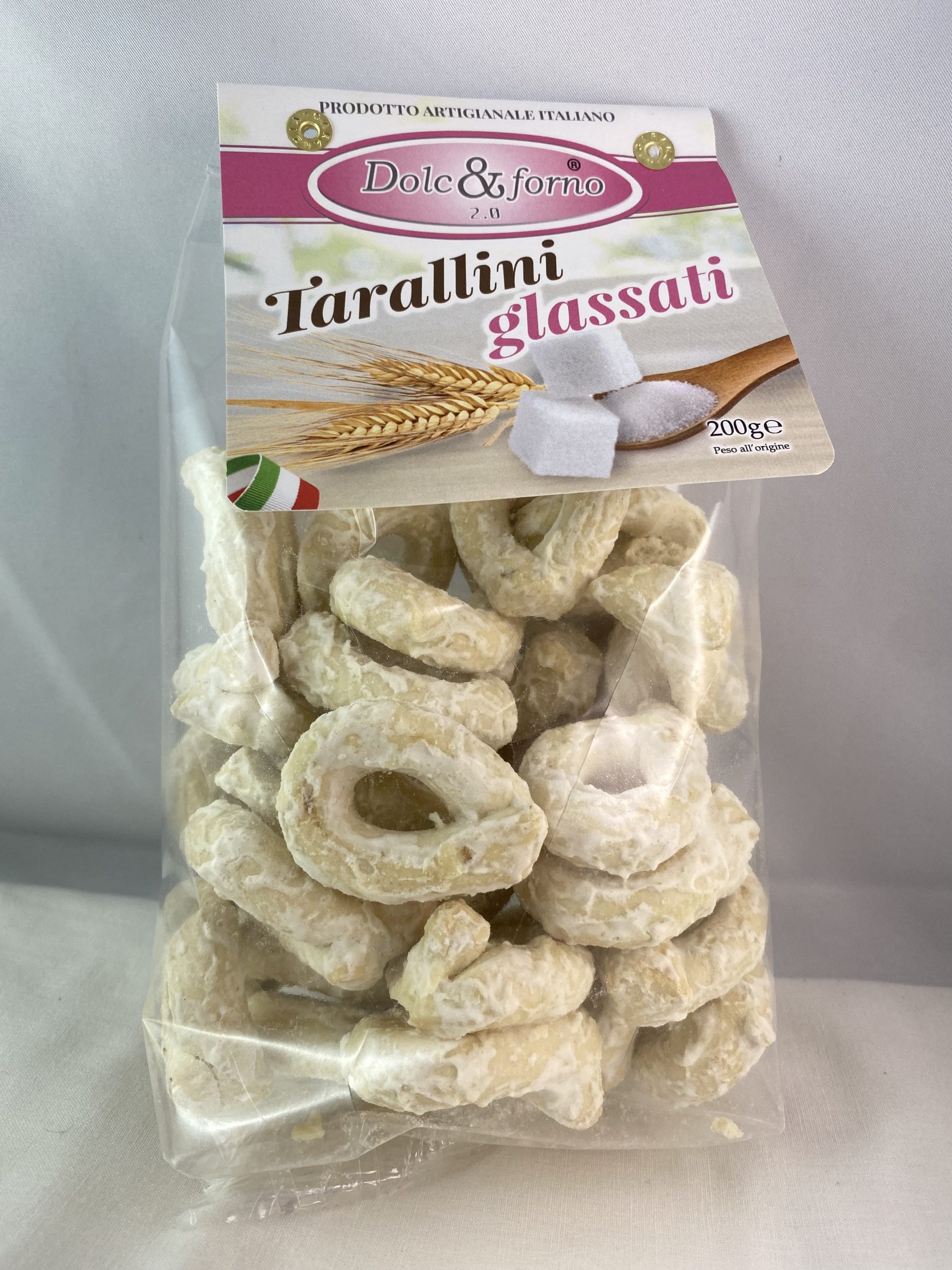 Ingredienti: Farina di grano tenero 0; vino (contiene solfiti);olio di semi di girasole alto oleioco; zucchero; sale; agenti lievitanti: bicarbonato di ammonio; aroma limone; zucchero glassato 35% .