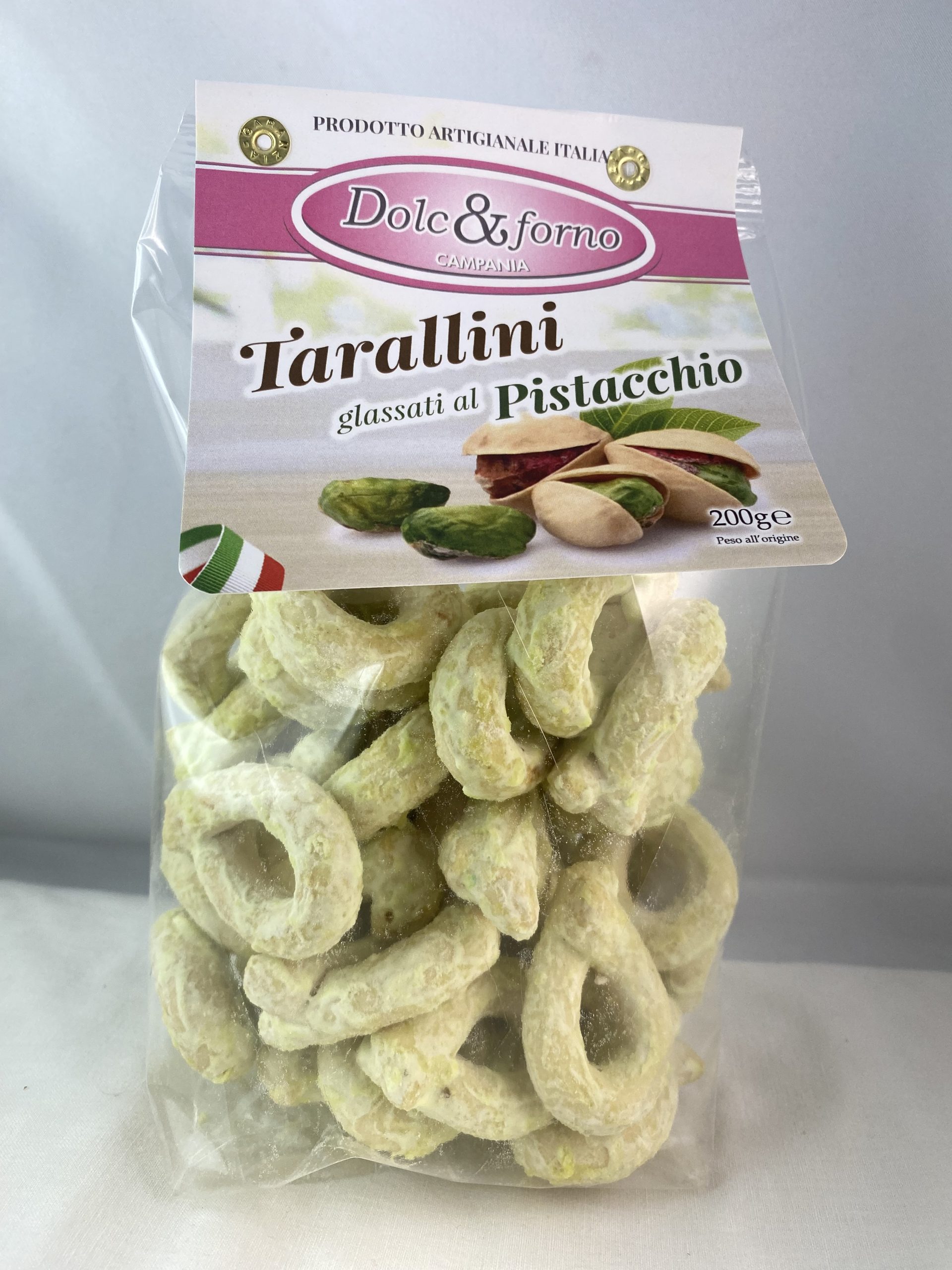 Ingredienti: Farina di grano tenero 0; vino (contiene solfiti);olio di semi di girasole alto oleioco; zucchero; sale; agenti lievitanti: bicarbonato di ammonio; aroma limone; zucchero glassato 35% ; aroma Pistacchio 0,6%.