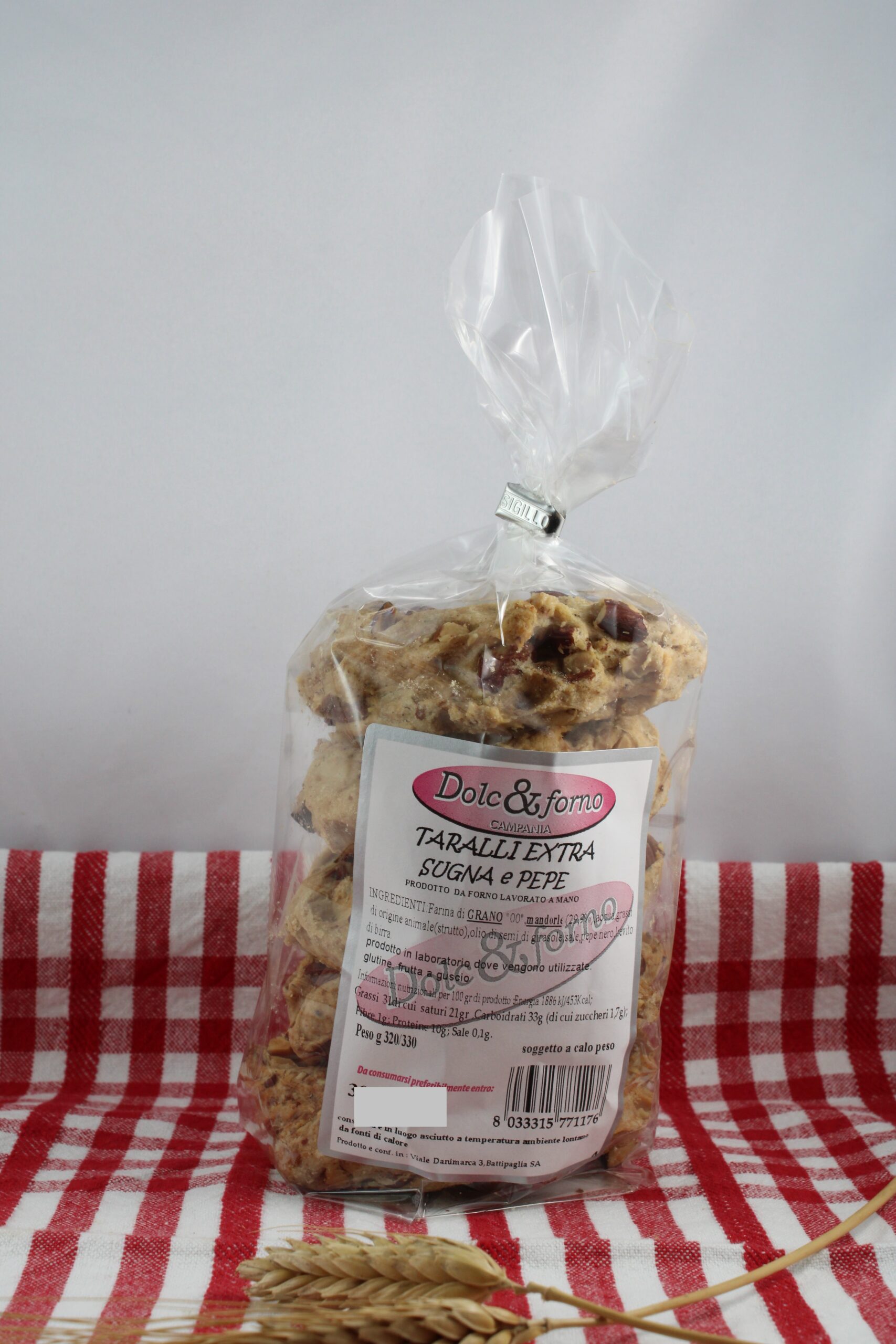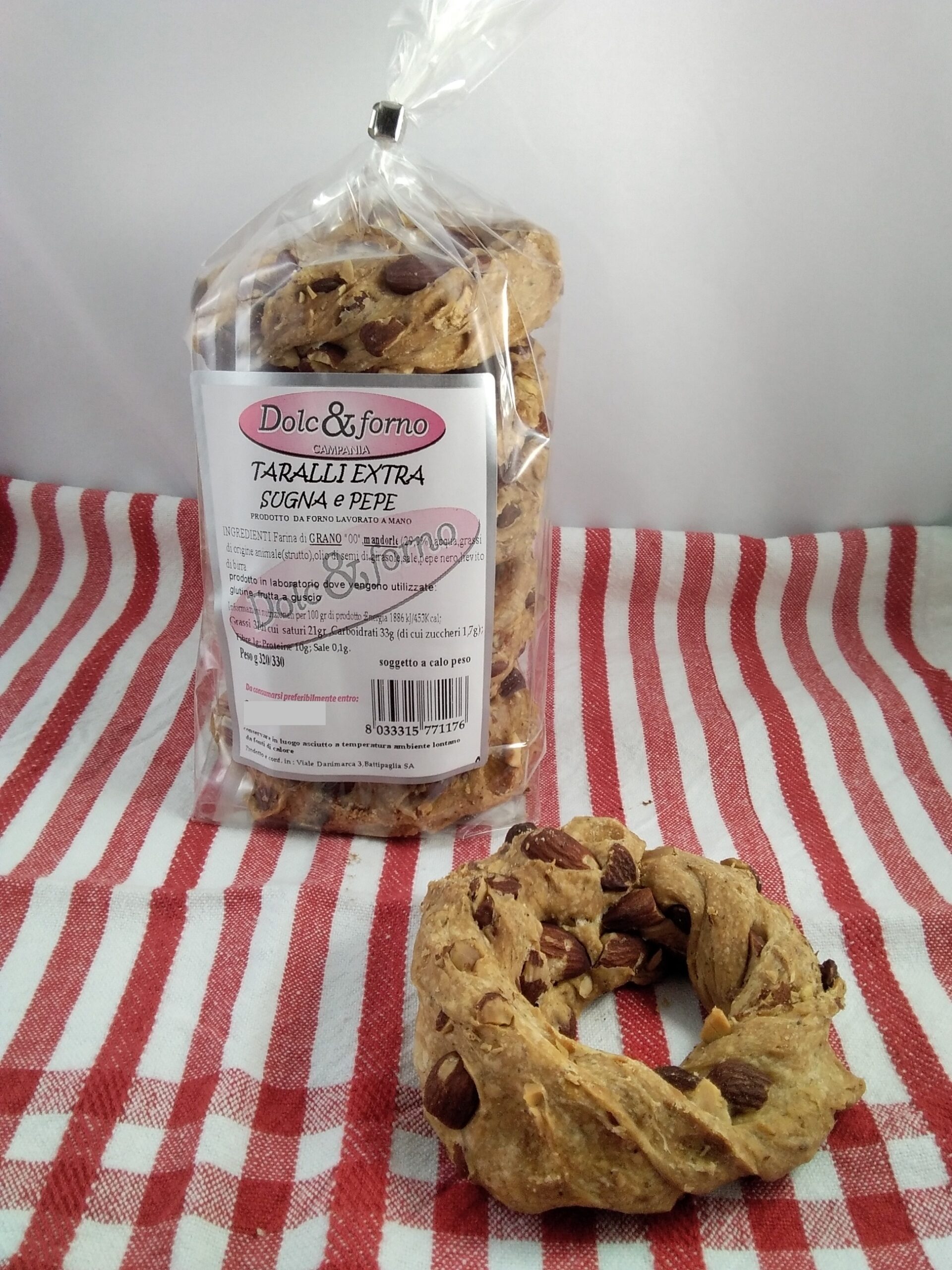 Ingredienti: Farina di Grano 00, MANDORLE (29%) ,acqua, grassi di origine animale (strutto), olio di semi di girasole, sale, pepe nero, lievito di birra.