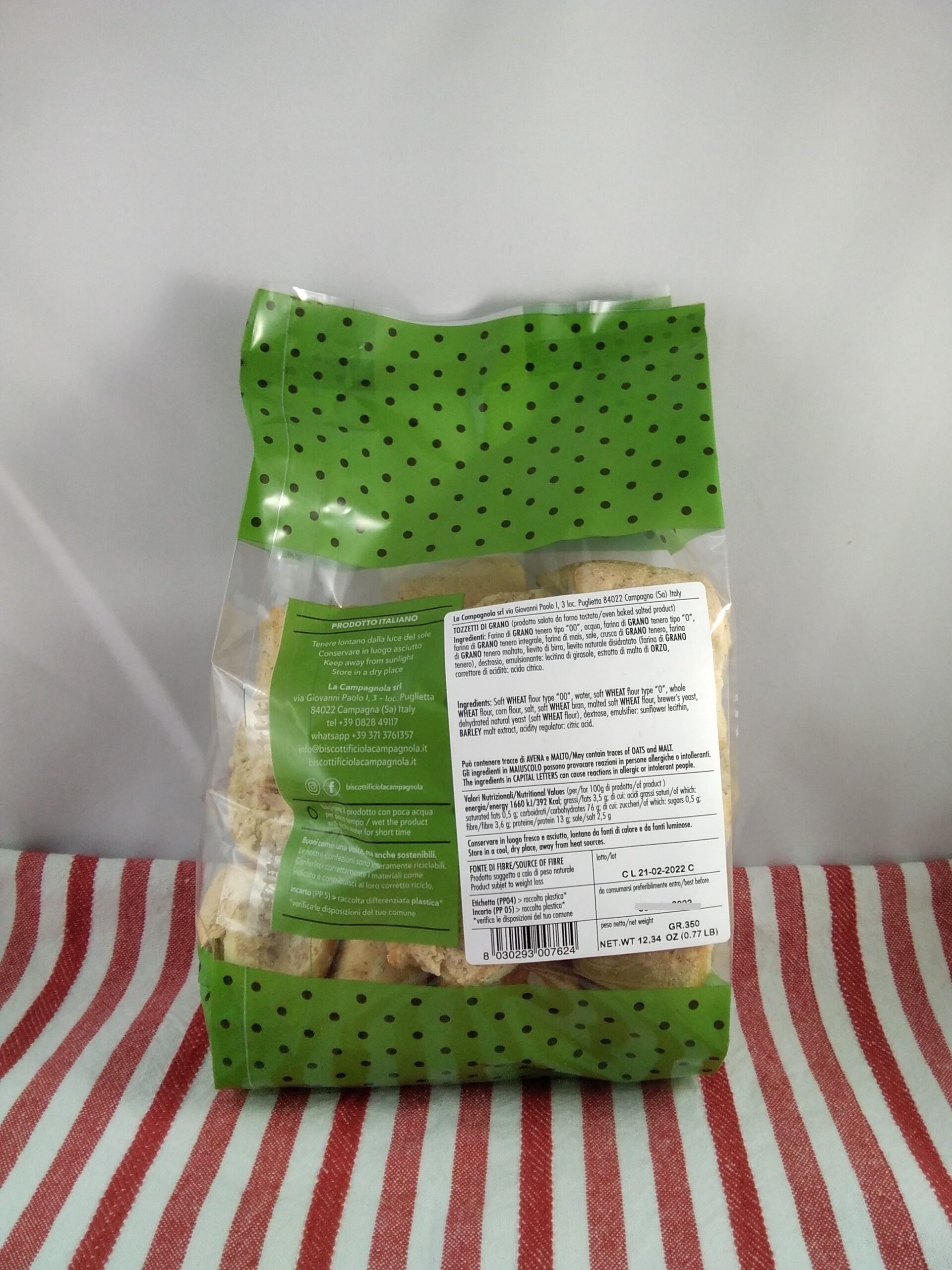 Ingredienti: Farina di frumento tenero, tipo 0 ‐ farina di frumento tenero, tipo 00 ‐ farina di mais (4%) ‐ farina di frumento, integrale ‐ crusca tostata di grano (2%) ‐ sale da cucina – agente lievitante ‐farina di malto ‐ lievito di birra, compresso –lecitina di soia – lievito madre – saccarosio – acido ascorbico ‐ acido citrico‐ acqua