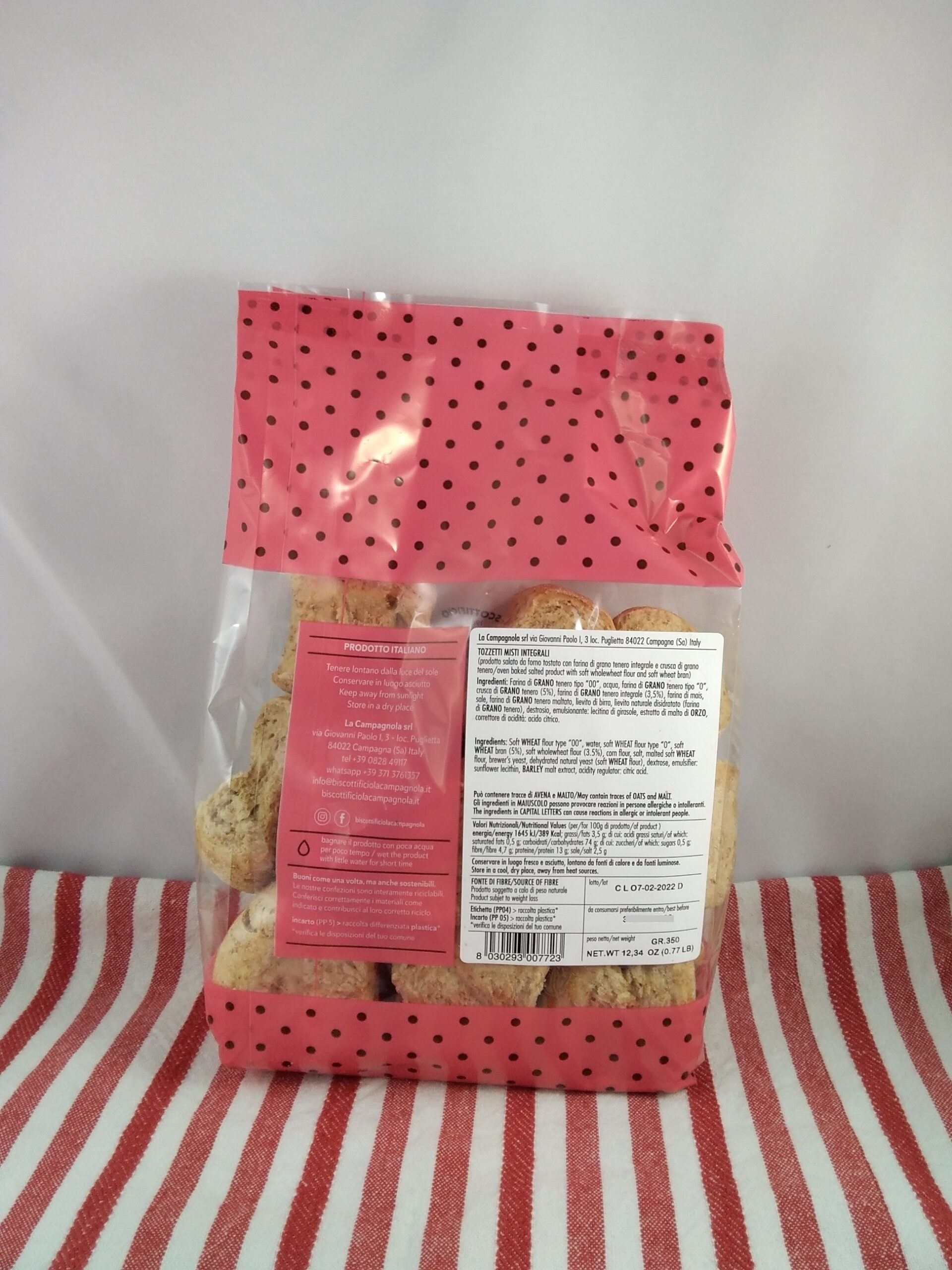 Ingredienti: Farina di frumento tenero, tipo 0 ‐ farina di frumento tenero, tipo 00 ‐ farina di frumento integrale (4,7%) ‐ farina di mais (4%) ‐ crusca tostata di grano (2%) ‐ sale da cucina – agente lievitante ‐farina di malto ‐ lievito di birra, compresso –lecitina di soia – lievito madre – saccarosio – acido ascorbico ‐ acido citrico‐ acqua.